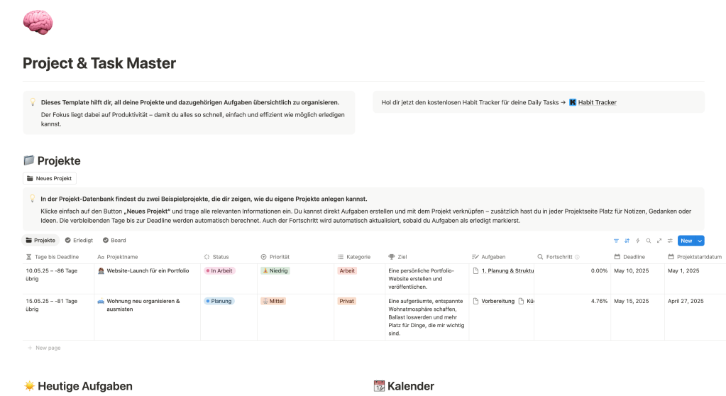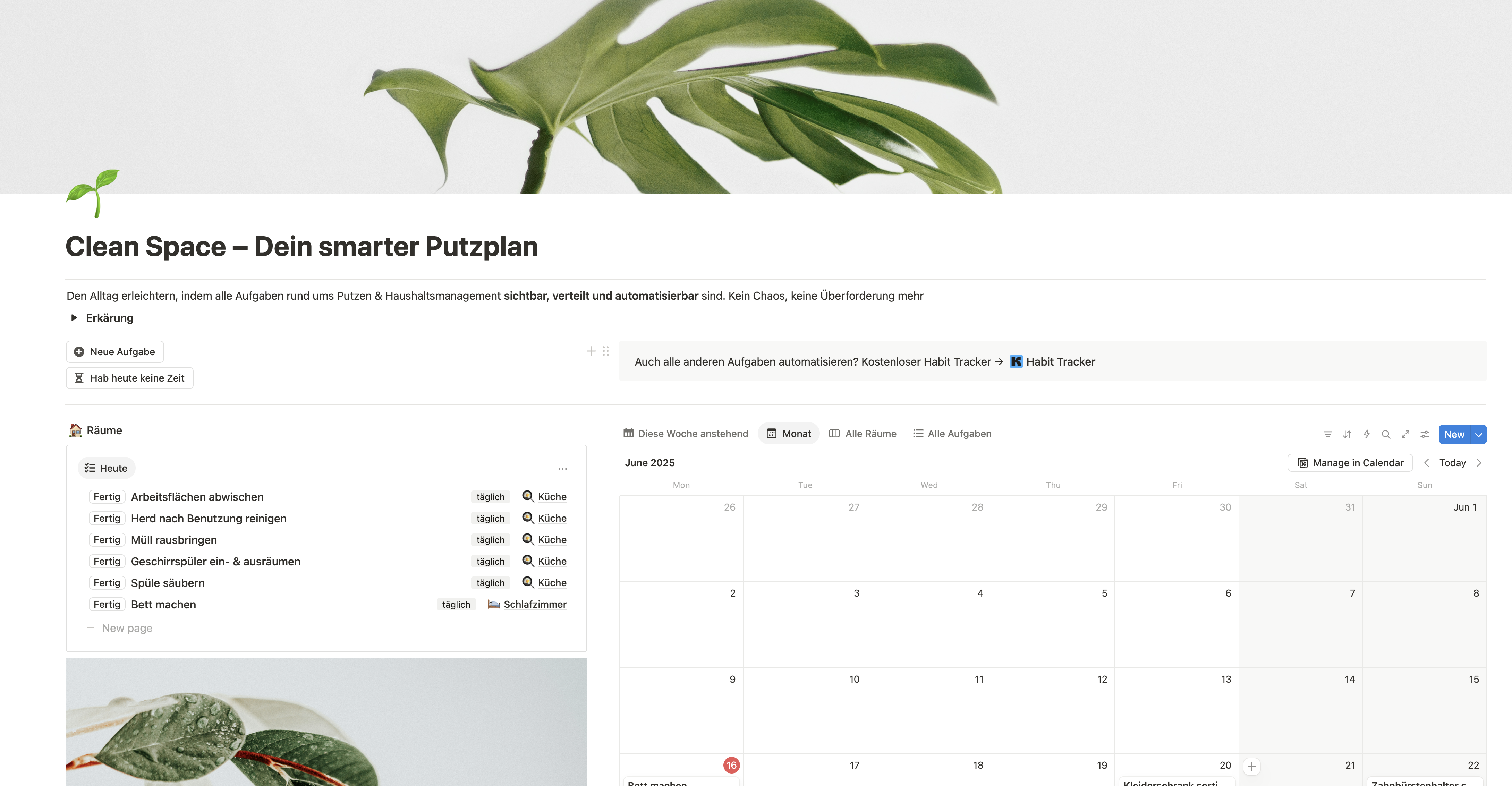 Dann ist der smarte Putzplan dein neuer Begleiter. Dieses minimalistische Notion-Template nimmt dir das Denken rund ums Putzen ab – sichtbar, verteilt und automatisiert